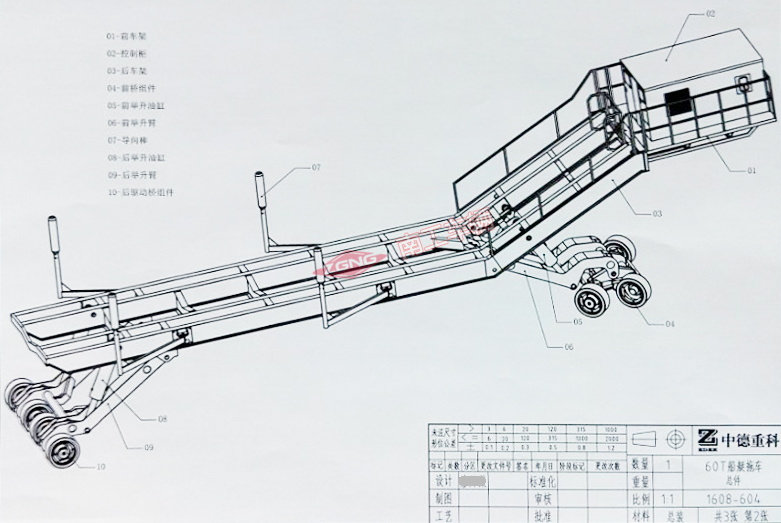 1、拖車(chē)承載拖行能力為60噸,平臺(tái)主框架采用30號(hào)型鋼,主梁四條50號(hào)高錳合金型鋼,最大寬度4米,長(zhǎng)度為19.8米,為方便運(yùn)輸整車(chē)設(shè)計(jì)為組件拼裝式,頂前部為電控箱、電池及液壓系統(tǒng)。底前部為轉(zhuǎn)向機(jī)構(gòu)控制系統(tǒng)。底部為兩套升降拖船支撐平行調(diào)整機(jī)構(gòu)。兩側(cè)各設(shè)計(jì)兩套可調(diào)視寬導(dǎo)向棒。